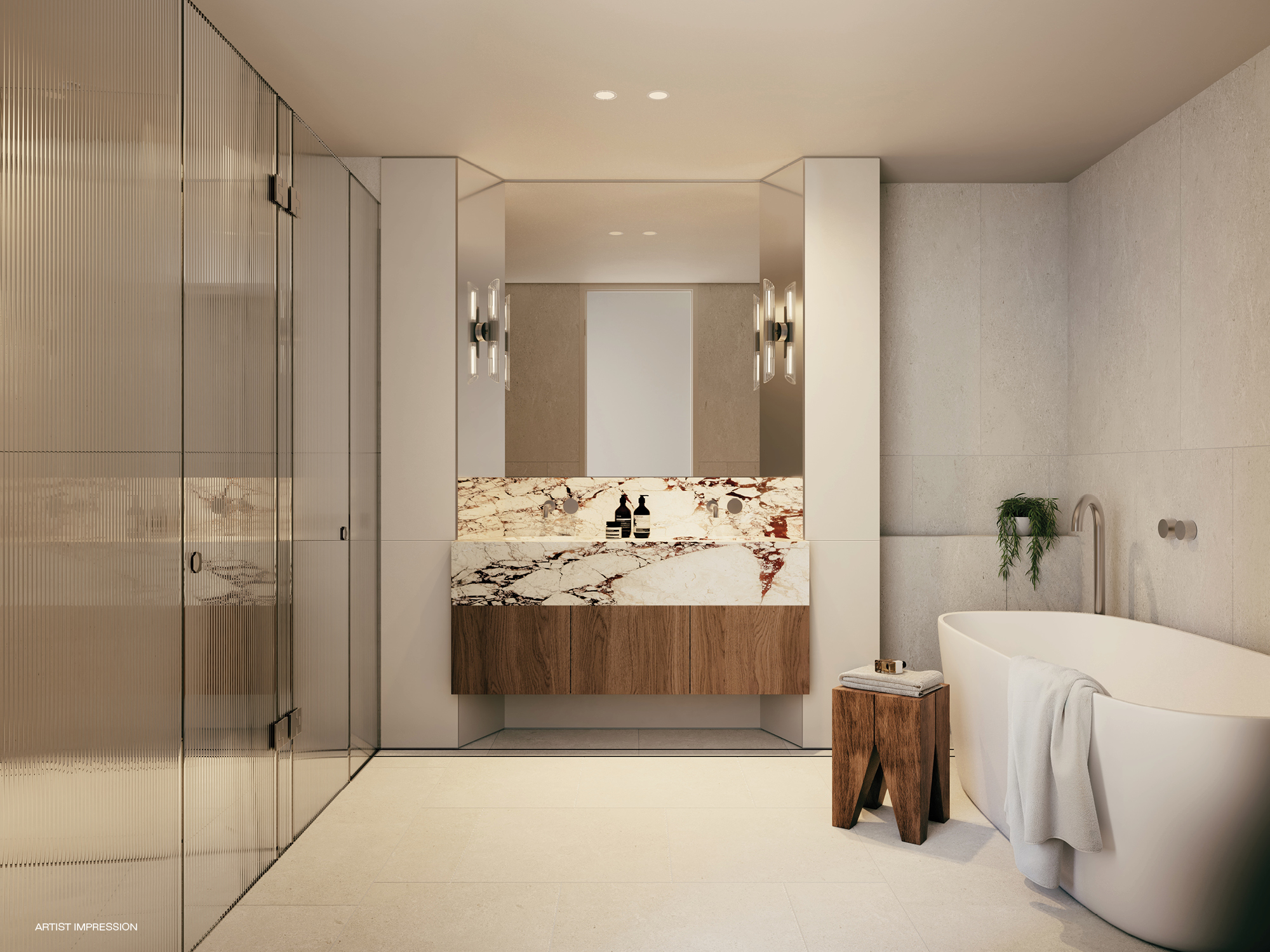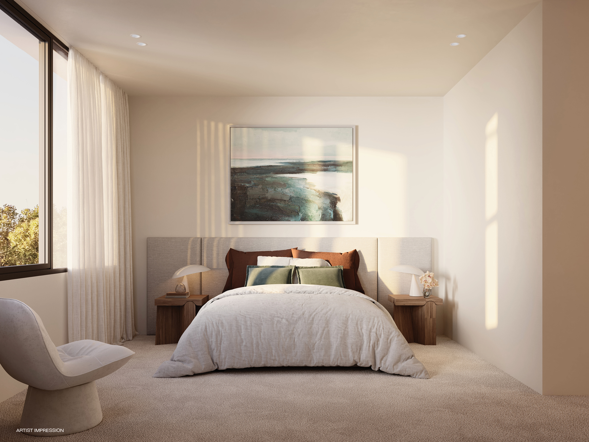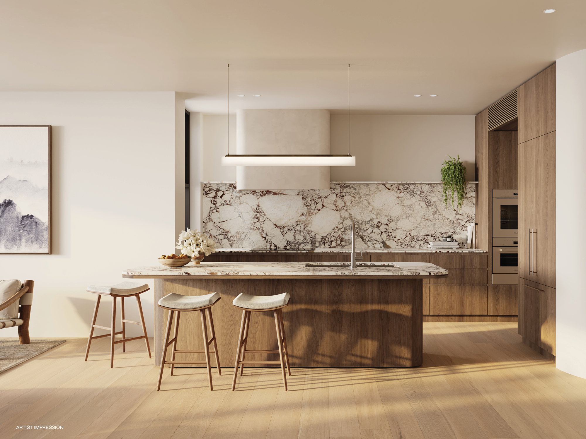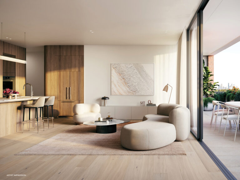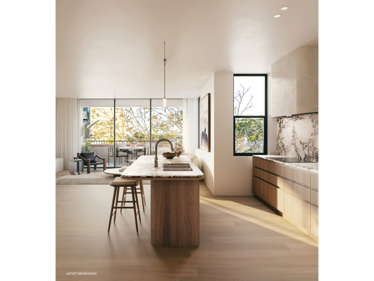 Rich textures and subtle touches of greenery create a modern collection that feels both grounded in place and designed for generous living. Inside, SJB-designed interiors are bright and open, with expansive layouts and a warm mix of materials. Timber joinery and stone surfaces craft spaces that are both comfortable and inviting.