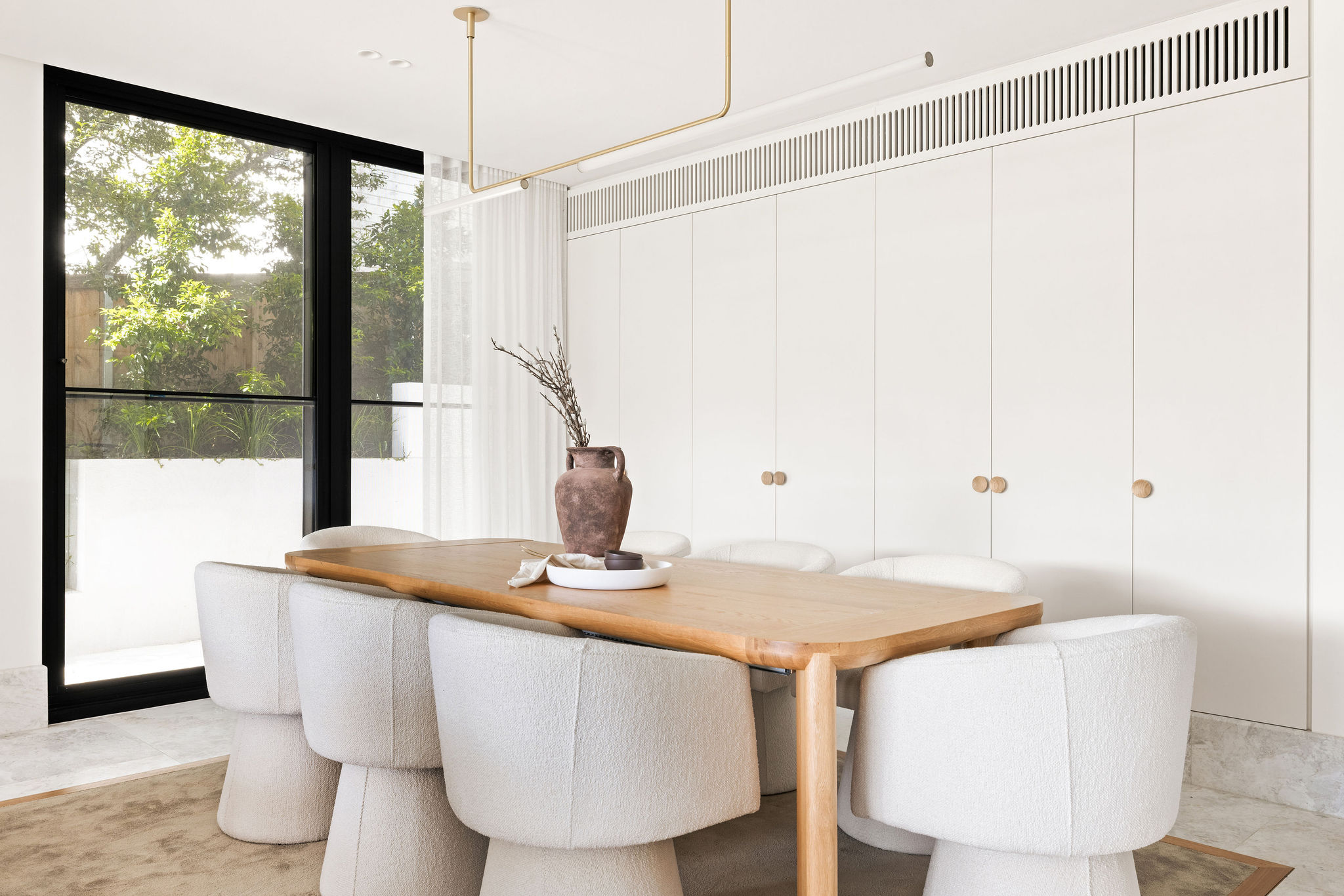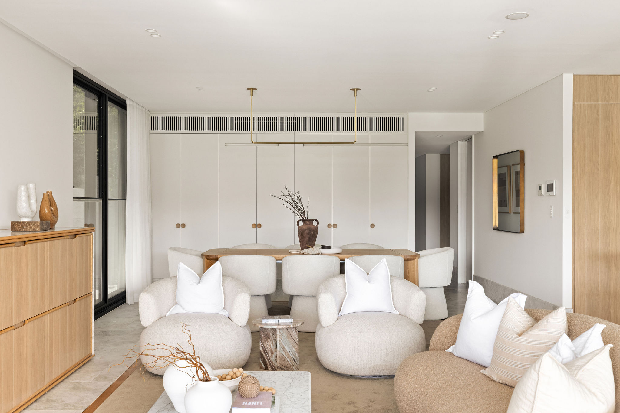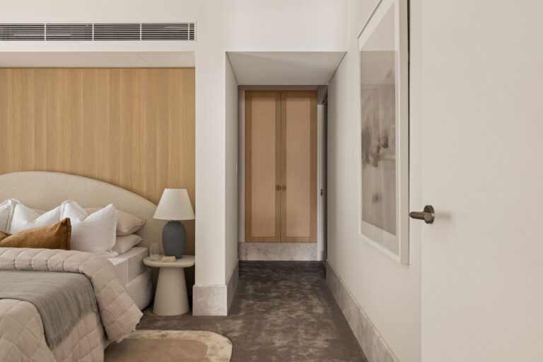 – Three generously proportioned bedrooms, each with bespoke built-in joinery. The master retreat features a walk-through wardrobe, an indulgent ensuite, and direct terrace access.