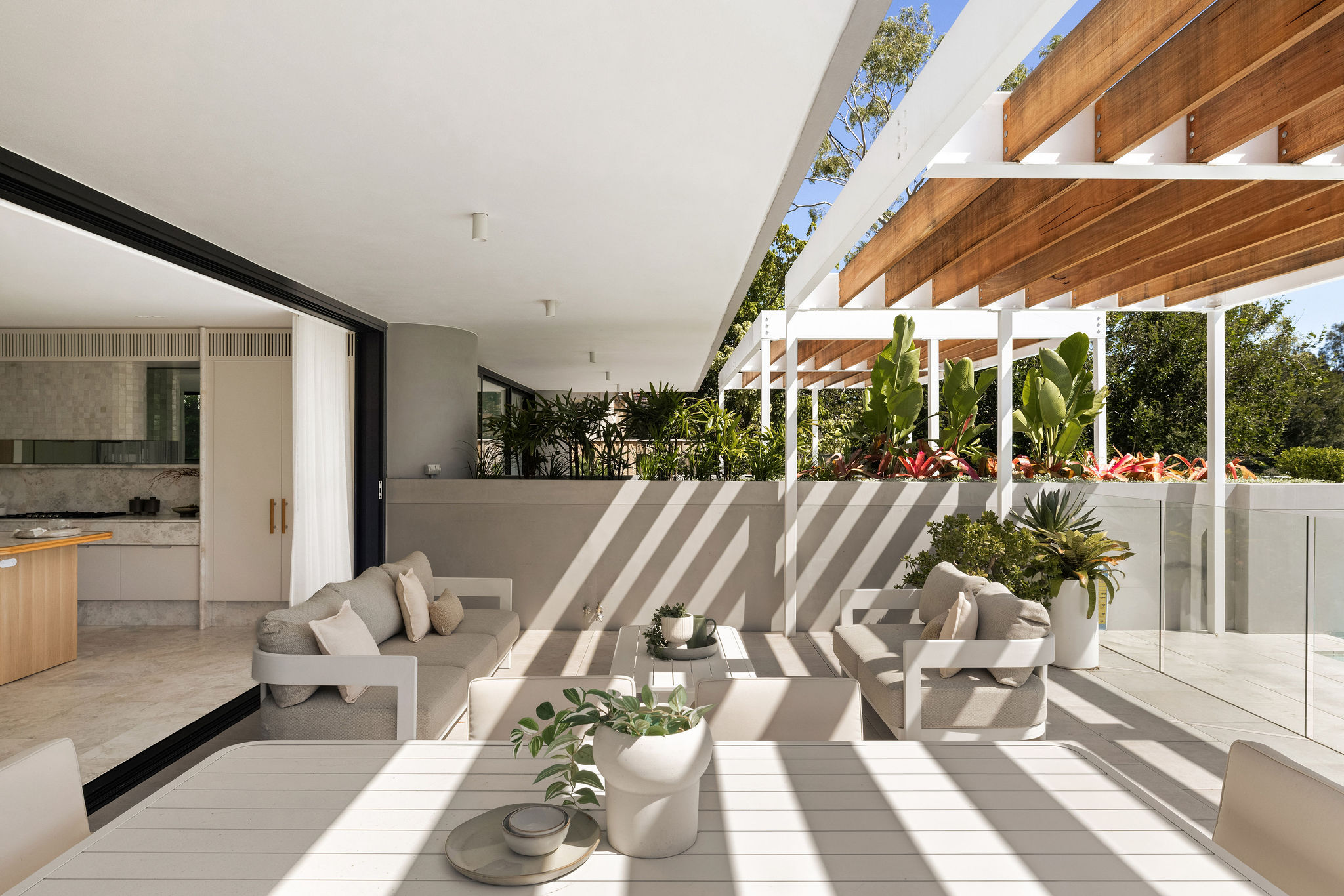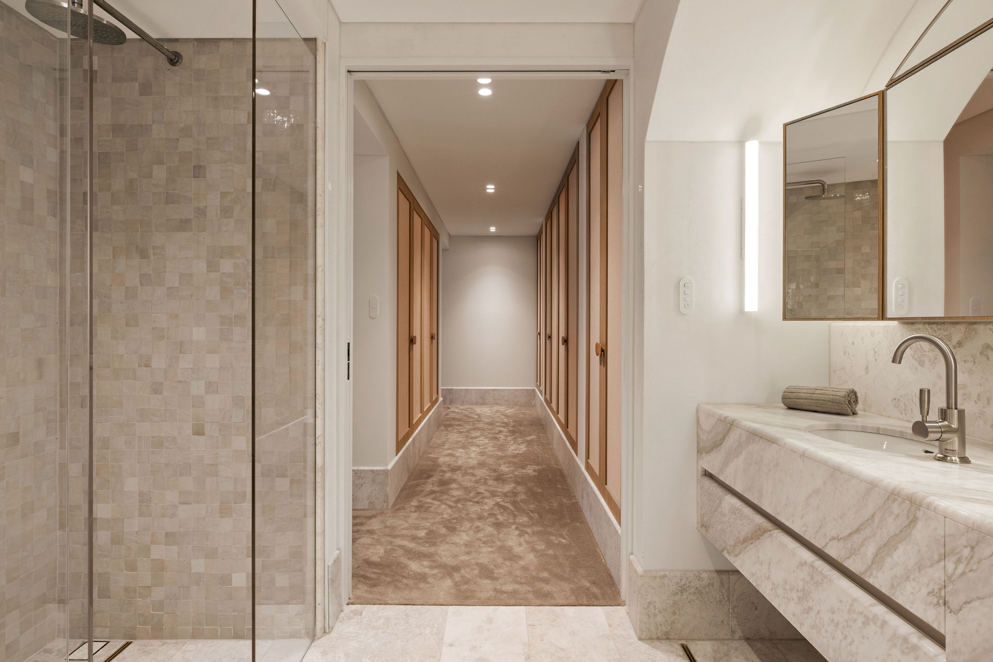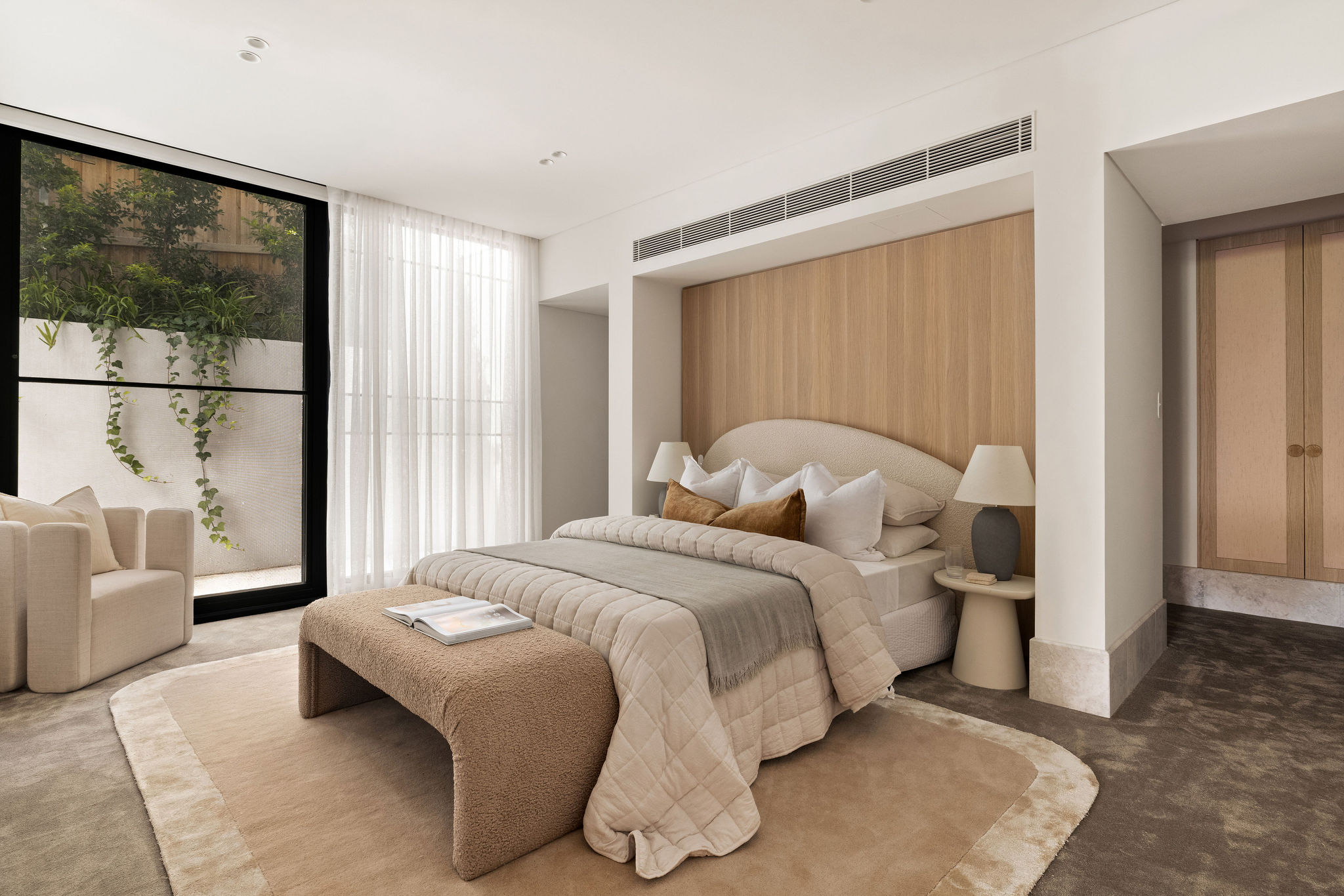 – Three generously proportioned bedrooms, each with bespoke built-in joinery. The master retreat features a walk-through wardrobe, an indulgent ensuite, and direct terrace access.