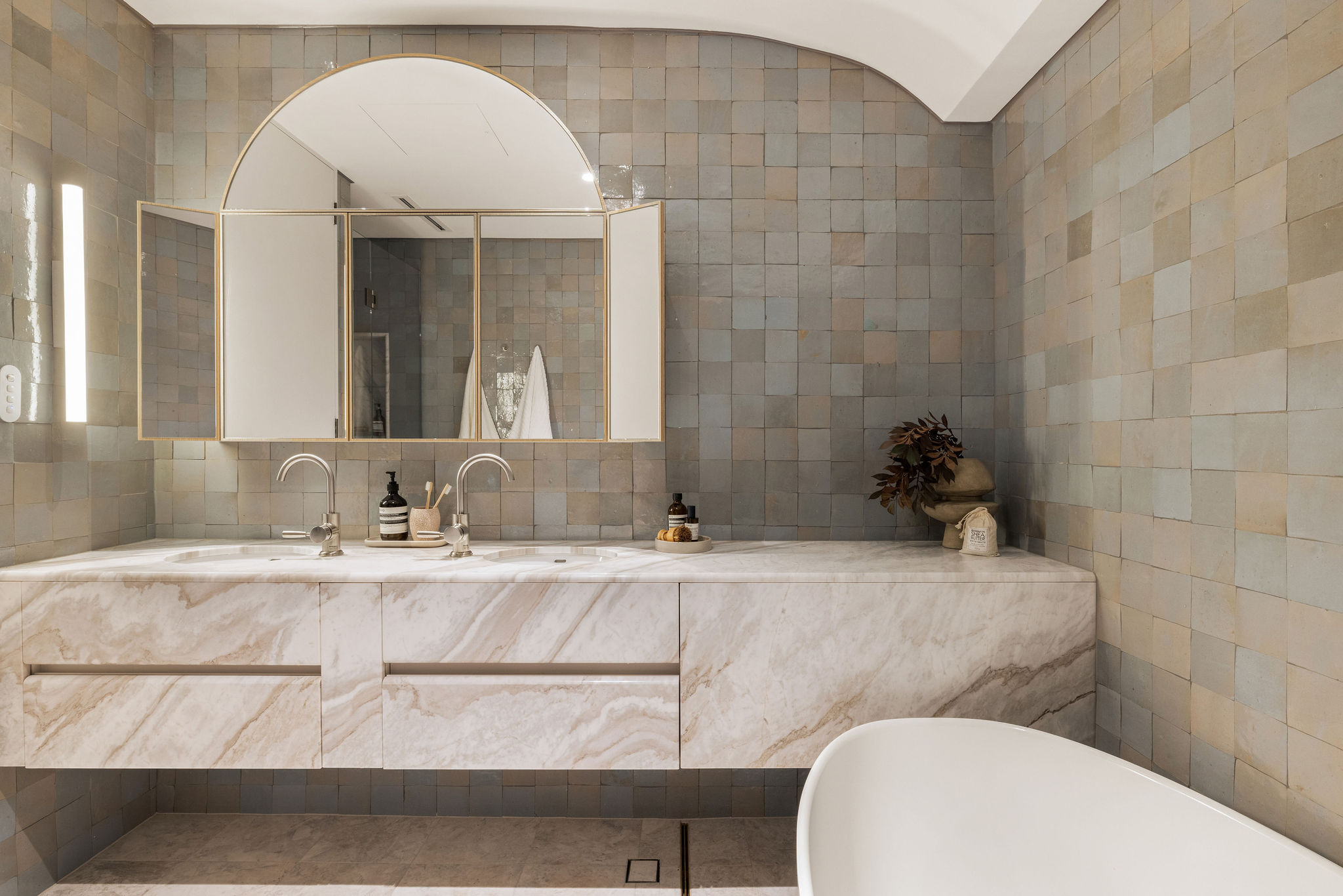 – Two spa-inspired bathrooms, both finished with honed stone and brushed-nickel tapware, one featuring a freestanding bath. Additional guest powder room.