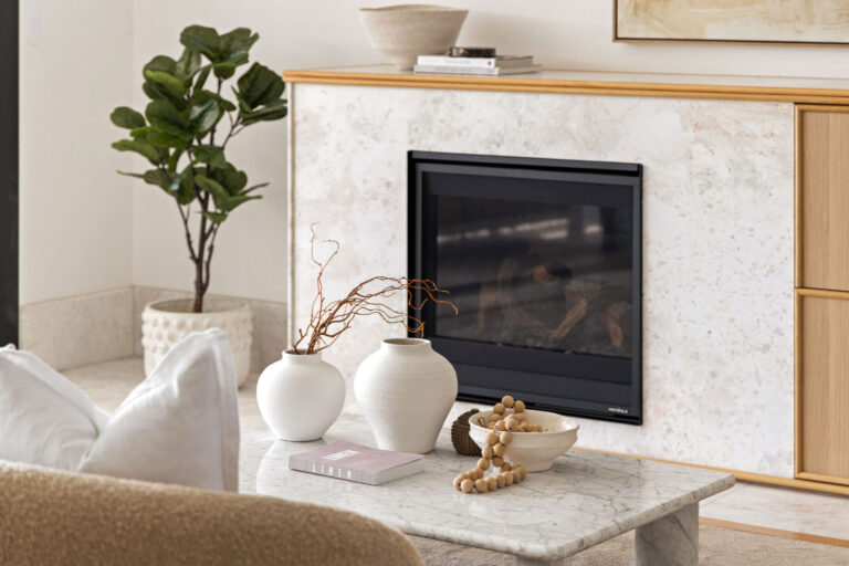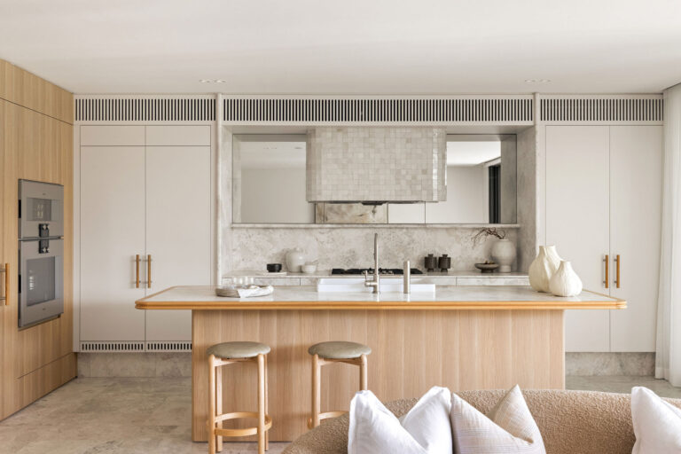 – Statement bullnose edged marble-wrapped kitchen featuring Gaggenau appliances, Liebherr refrigeration, walk-in pantry, custom joinery and a generous island bench designed for effortless entertaining.